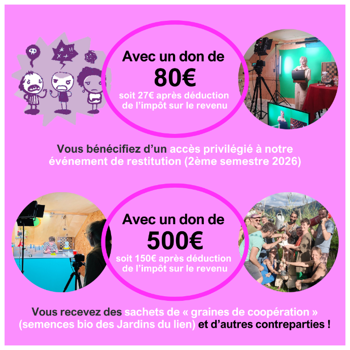 Un don mensuel défiscalisable par exemple de 8€ (soit 2,7€ après réduction fiscale) contribue à ce que nous puissions déployer différents projets d'intérêt général, en faveur de la coopération autour des transitions en cours.